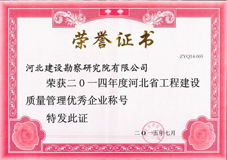 近日,根據(jù)河北省建筑業(yè)協(xié)會冀建協(xié)字[2105]25號文《關(guān)于繼續(xù)開展河北省工程建設(shè)質(zhì)量管理優(yōu)秀企業(yè)評選表彰活動的通知》,我公司榮獲“二〇一四年度河北省工程建設(shè)質(zhì)量管理優(yōu)秀企業(yè)稱號”。