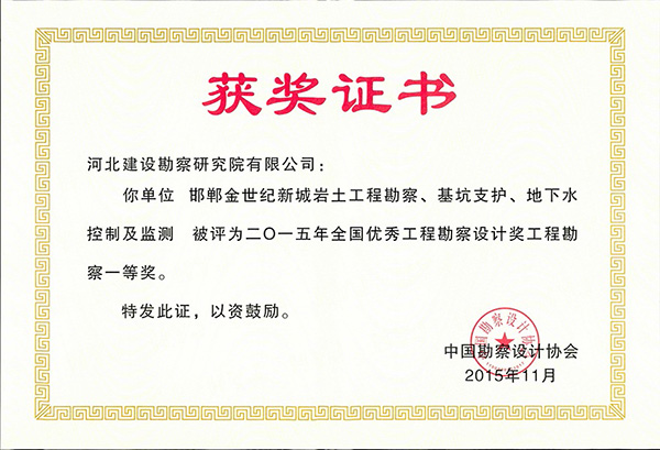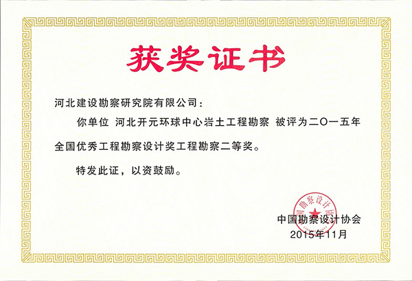 近日,公司兩項(xiàng)工程分別榮獲2015年度全國優(yōu)秀工程勘察設(shè)計(jì)工程勘察一、二等獎(jiǎng).一等獎(jiǎng):邯鄲金世紀(jì)新城巖土工程勘察、基坑支護(hù)、地下水控制及監(jiān)測;二等獎(jiǎng):河北開元環(huán)球中心巖土工程勘察。