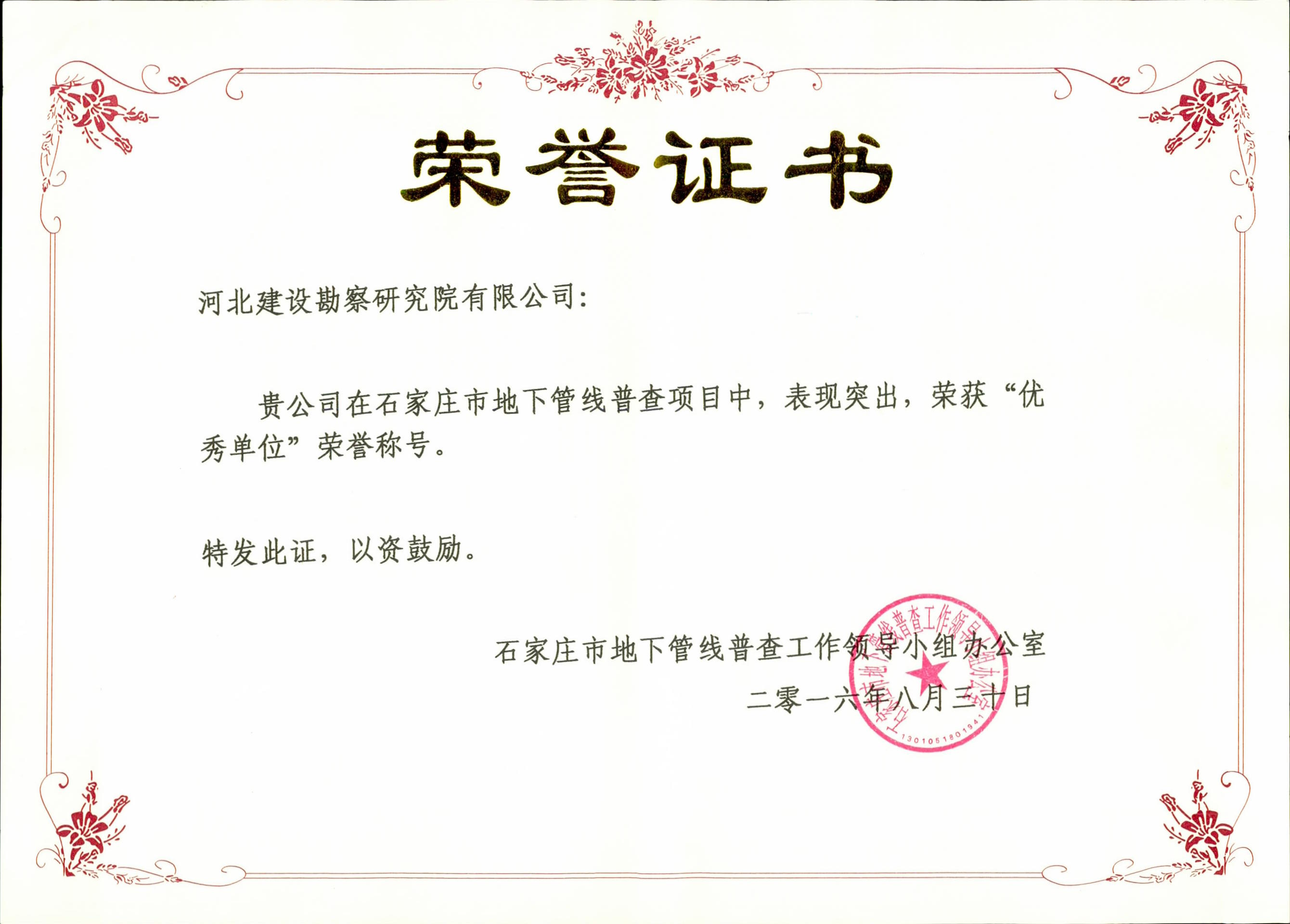 公司承擔(dān)的石家莊市地下管線普查項(xiàng)目于近日完工,并順利通過石家莊市地下管線普查工作領(lǐng)導(dǎo)小組檢查。石家莊市地下管線普查工作領(lǐng)導(dǎo)小組充分肯定了我公司在該項(xiàng)目中取得的成績和突出的表現(xiàn),特頒發(fā)“優(yōu)秀單位”榮譽(yù)證書,以資鼓勵(lì)。