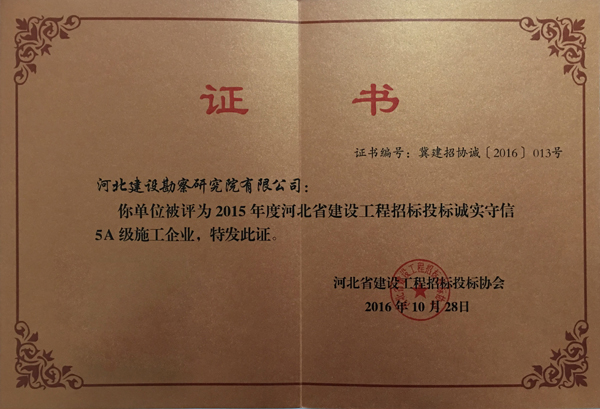 近日,公司被河北省建設(shè)工程招標投標協(xié)會評為2015年度河北省建設(shè)工程招標投標誠實守信5A級施工企業(yè)單位。