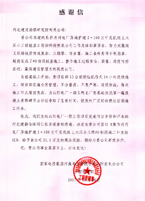 我公司承建的焦作丹河電廠異地擴建2×100萬千瓦機組上大壓小工程樁基工程,始終按照業(yè)主工作總體部署要求,努力克服施工現(xiàn)場地質(zhì)情況復(fù)雜、工期緊、任務(wù)重、施工條件差等不利因素,超前完成了#0標段樁基施工,整個施工過程安全、質(zhì)量、進度可控在控,贏得了建設(shè)管理方的高度認可。11月28日,國家電投集團河南電力有限公司沁陽發(fā)電分公司工程管理部發(fā)來感謝信,對我公司項目部員工表示感謝,并期待與我公司的再度合作。