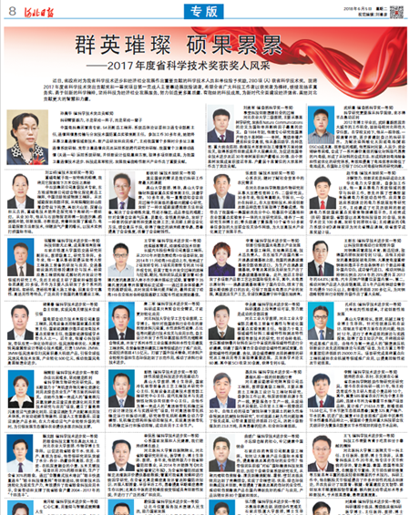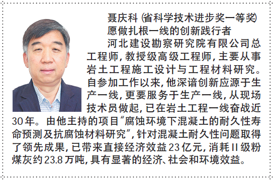 6月5日,河北日報(bào)專版文章《群英薈萃 碩果累累》對2017年度河北省科學(xué)技術(shù)獎(jiǎng)獲獎(jiǎng)人風(fēng)采進(jìn)行展示。我公司的完成的《腐蝕環(huán)境下混凝土的耐久性壽命預(yù)測及抗腐蝕材料研究》獲得一等獎(jiǎng),聶慶科總工程師作為第一完成人在專版文章中進(jìn)行了刊載,這是以聶總為代表的廣大專業(yè)技術(shù)人員的共同光榮,也必將激勵(lì)我們更加努力爭創(chuàng)新的科技成果和榮譽(yù)。