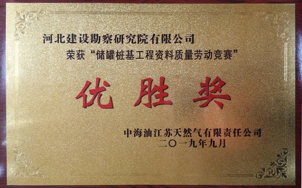 由我公司承建的江蘇液化天然氣(LNG)接收站1#、2#儲(chǔ)罐樁基工程已于2019年09月01日施工完成,2019年12月01日全部檢測完成,樁基檢測結(jié)果全為Ⅰ類樁。在施工期間的質(zhì)量安全管理及我公司項(xiàng)目部的工作作風(fēng)和工作態(tài)度受到了總包、監(jiān)理及業(yè)主單位的充分肯定。在江蘇液化天然氣(LNG)接收站工程項(xiàng)目完工之際,為我公司頒發(fā)了“優(yōu)秀承包商”證書。在建設(shè)單位組織的“儲(chǔ)罐樁基工程資料質(zhì)量勞動(dòng)競賽”中,通過項(xiàng)目部的努力及公司的全力幫助,獲得優(yōu)勝獎(jiǎng)。