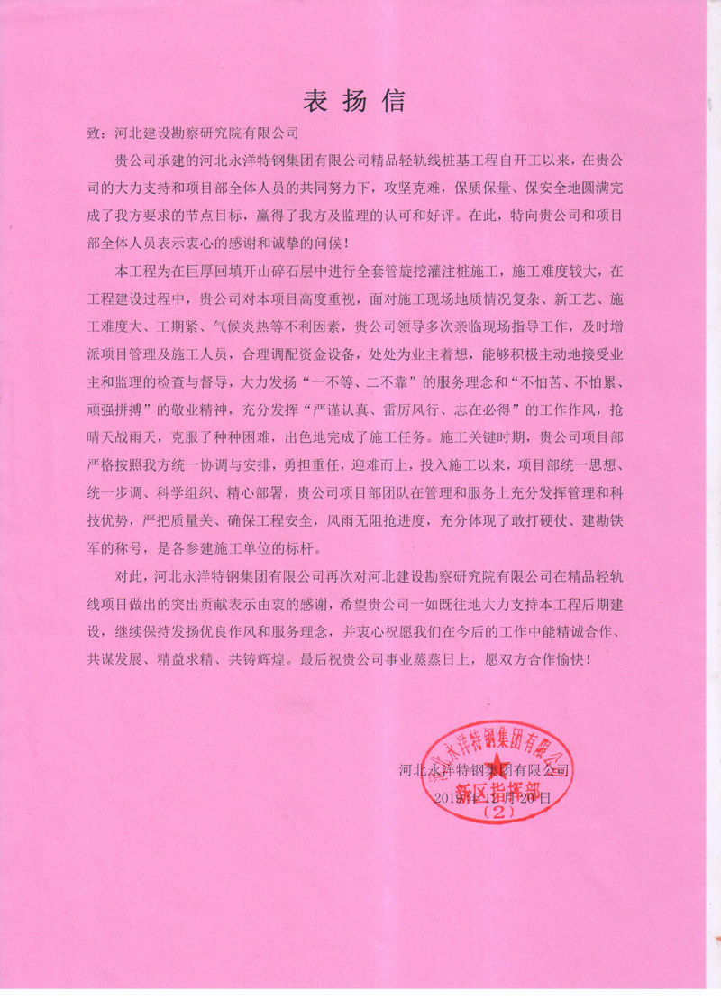 近日,我公司河北永洋特鋼集團(tuán)有限公司精品輕軌線樁基工程收到河北永洋特鋼集團(tuán)有限公司的表揚(yáng)信。項(xiàng)目部全體員工大力發(fā)揚(yáng)“一不等、二不靠”的服務(wù)理念和“不怕苦、不怕累、頑強(qiáng)拼搏”的敬業(yè)精神,充分發(fā)揮“嚴(yán)謹(jǐn)認(rèn)真、雷厲風(fēng)行、志在必得”的工作作風(fēng),搶晴天戰(zhàn)雨天,克服了種種困難,出色地完成了施工任務(wù)。甲方對項(xiàng)目部全體員工的辛勤付出,給予了高度認(rèn)可和評價,并為后續(xù)雙方的合作奠定了良好基礎(chǔ)。并衷心祝愿我們在今后的工作中能精誠合作、共謀發(fā)展、精益求精、共鑄輝煌。