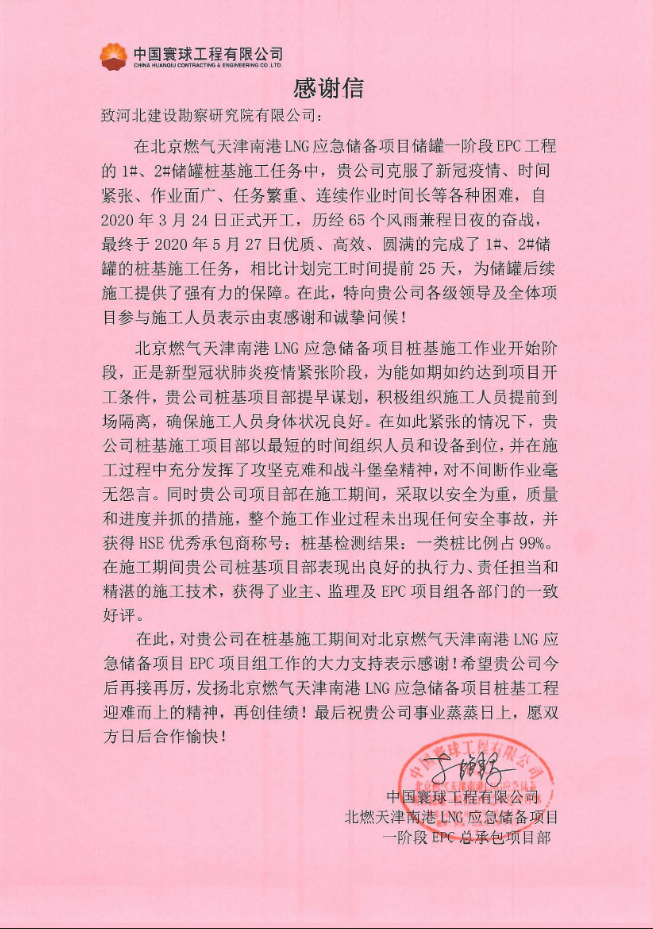 由我公司承建的北京燃氣天津南港LNG應急儲備項目1#、2#儲罐樁基工程,自2020年3月24日正式開工,歷經(jīng)65個日夜的奮戰(zhàn),最終于2020年5月27日優(yōu)質(zhì)、高效、圓滿的完成了1#、2#儲罐的樁基施工任務(wù)。中國寰球工程有限公司北京燃氣天津南港LNG應急儲備項目儲罐一階段EPC項目組,對我公司北燃樁基項目組表示由衷的感謝,感謝我公司領(lǐng)導及全體項目施工人員的辛勤付出,在克服了新冠疫情、時間緊張、作業(yè)面廣、任務(wù)繁重、連續(xù)作業(yè)時間長等各種困難的情況下,奮勇向前,較原定工期提前25天完成施工任務(wù),為項目后續(xù)施工帶來了強有力的工期保障。同時對我公司在樁基施工期間對北京燃氣天津南港LNG應急儲備項目EPC項目組工作的大力支持表示感謝!希望我公司今后再接再厲,繼續(xù)發(fā)揚迎難而上的精神,再創(chuàng)佳績!