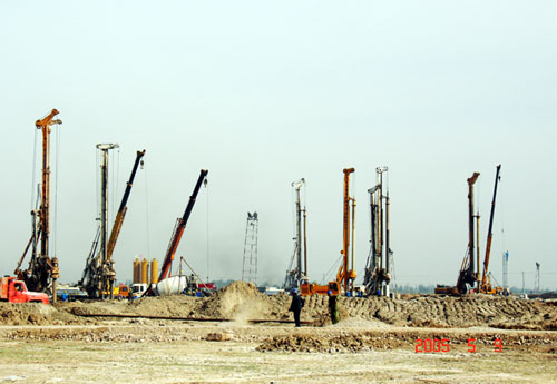 樁基采用鉆孔混凝土灌注樁和振沖碎石樁,灌注樁樁徑800mm,樁長(zhǎng)20~30m,混凝土總量62000余立方,振沖碎石樁53000余立方。