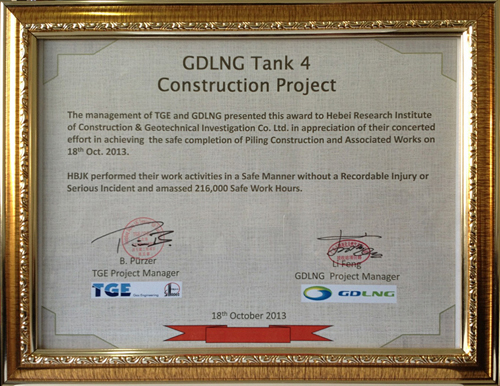 廣東大鵬LNG工程自2013年4月18日開工,至2013年9月4日完成樁基施工,10月份完成包括鑿樁頭在內(nèi)的所有現(xiàn)場施工任務(wù)。在此期間,項(xiàng)目部全體成員一直堅(jiān)持安全第一的理念,嚴(yán)格按照總包、業(yè)主的安全文明施工要求穩(wěn)步推進(jìn)工作,得到了總包、監(jiān)理、業(yè)主的一致好評(píng),工程結(jié)束后總包TGE為我公司頒發(fā)了安全文明施工獎(jiǎng)狀。