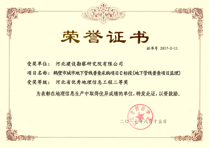 近日,經(jīng)河北省測(cè)繪學(xué)會(huì)評(píng)選,由我公司承擔(dān)的鶴壁市城市地下管線普查采購(gòu)項(xiàng)目C標(biāo)段(地下管線普查項(xiàng)目監(jiān)理)榮獲河北省優(yōu)秀地理信息工程二等獎(jiǎng)。