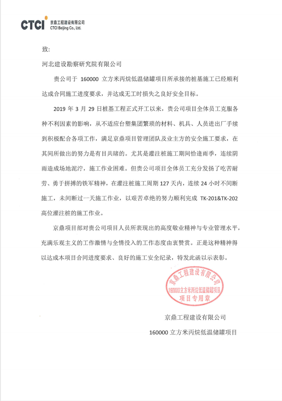 我公司承接的160000立方米丙烷低溫儲罐樁基施工工程,自開工以來,項目部全體員工克服各種不利因素的影響,經過艱苦卓絕的不懈努力,已順利達成合同施工進度要求,并達成無工時損失之良好安全目標,滿足京鼎項目團隊及業(yè)主方的安全施工要求,已圓滿完成各項施工任務,順利完工。期間所表現出的高度敬業(yè)精神和專業(yè)管理水平,得到了業(yè)主和監(jiān)理的一致好評,近期特向我公司發(fā)函予以表揚。