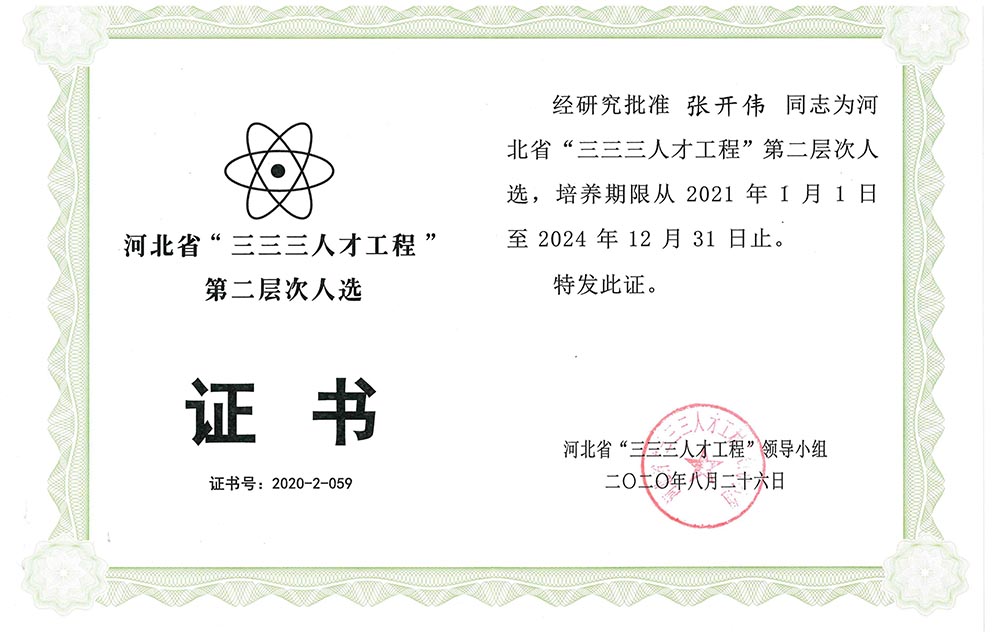 經(jīng)公司申報、石家莊市人力資源和社會保障局推薦,河北省“三三三人才工程”領(lǐng)導(dǎo)小組批準(zhǔn),公司張開偉同志榮獲2020年度河北省“三三三人才工程”第二層次人選,韓文永、孫廣兩名同志榮獲2020年度河北省“三三三人才工程”第三層次人選。