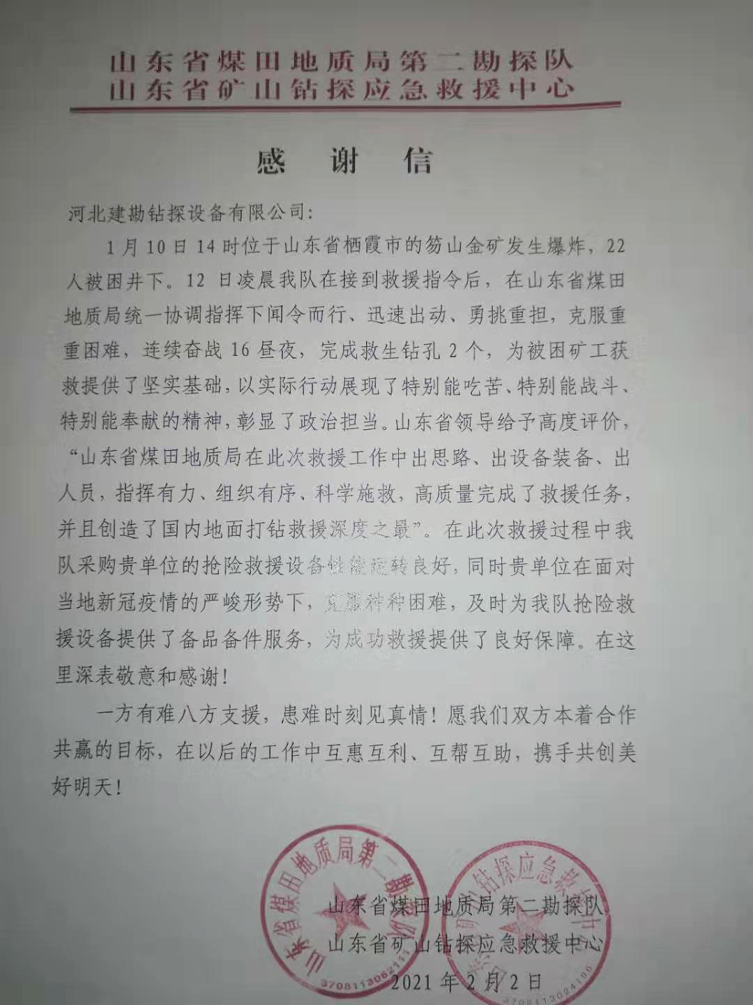 1月10日14時(shí),位于山東省棲霞市的笏山金礦發(fā)生爆炸,22人被困井下。山東省煤田地質(zhì)局第二勘探隊(duì)、山東省礦山鉆探應(yīng)急救援中心連續(xù)奮戰(zhàn)16晝夜,完成救生鉆孔2個(gè),為被困礦工獲救提供了堅(jiān)實(shí)基礎(chǔ),高質(zhì)量完成了救援任務(wù),并且創(chuàng)造了國(guó)內(nèi)地面打鉆救援深度之最。在此次救援過(guò)程中,河北建勘鉆探設(shè)備公司提供的搶險(xiǎn)救援設(shè)備性能運(yùn)轉(zhuǎn)良好,并且在面對(duì)當(dāng)?shù)匦鹿谝咔榈膰?yán)峻形勢(shì)下,克服種種困難,及時(shí)為救援隊(duì)搶險(xiǎn)救援設(shè)備提供了備品備件服務(wù),為成功救援提供了良好保障。為此,山東省煤田地質(zhì)局第二勘探隊(duì)和山東省礦山鉆探應(yīng)急救援中心在感謝信中深表敬意和感謝,并希望雙方本著合作共贏的目標(biāo),在以后的工作中互惠互利、互幫互助,攜手共創(chuàng)美好明天。