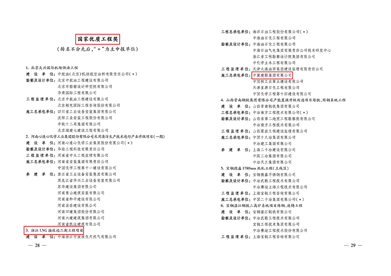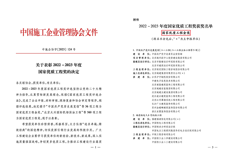 12月9日,中國施工企業(yè)管理協(xié)會發(fā)布了《關于表彰2022-2023年度國家優(yōu)質工程獎的決定》(中施企協(xié)字[2023]124號),我公司參與建設的3項工程獲得國家優(yōu)質工程獎,其中1項工程獲得國家優(yōu)質工程金獎。