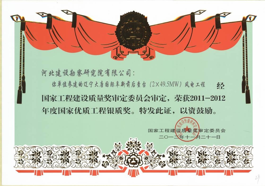 由我公司參與施工的遼寧大唐國際阜新前后查臺(2×49.5MW)風(fēng)電工程被國家工程建設(shè)質(zhì)量獎(jiǎng)評定委員會(huì)評定為2011-2012年度“國家優(yōu)質(zhì)工程銀質(zhì)獎(jiǎng)”。